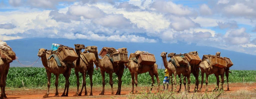 We travelled 19 km today and soon found ourselves leaving the tropical vegetation around Lake Chala into more acacia trees that we have become so accustomed to. Also, more wildlife appeared, including a lone elephant, wildebeest, Thompson gazelle, oryx, and some zebra whose white stripes were more red than white in this area, indicative of the red Tsavo soils that we are walking on (no dust or mud now though!)